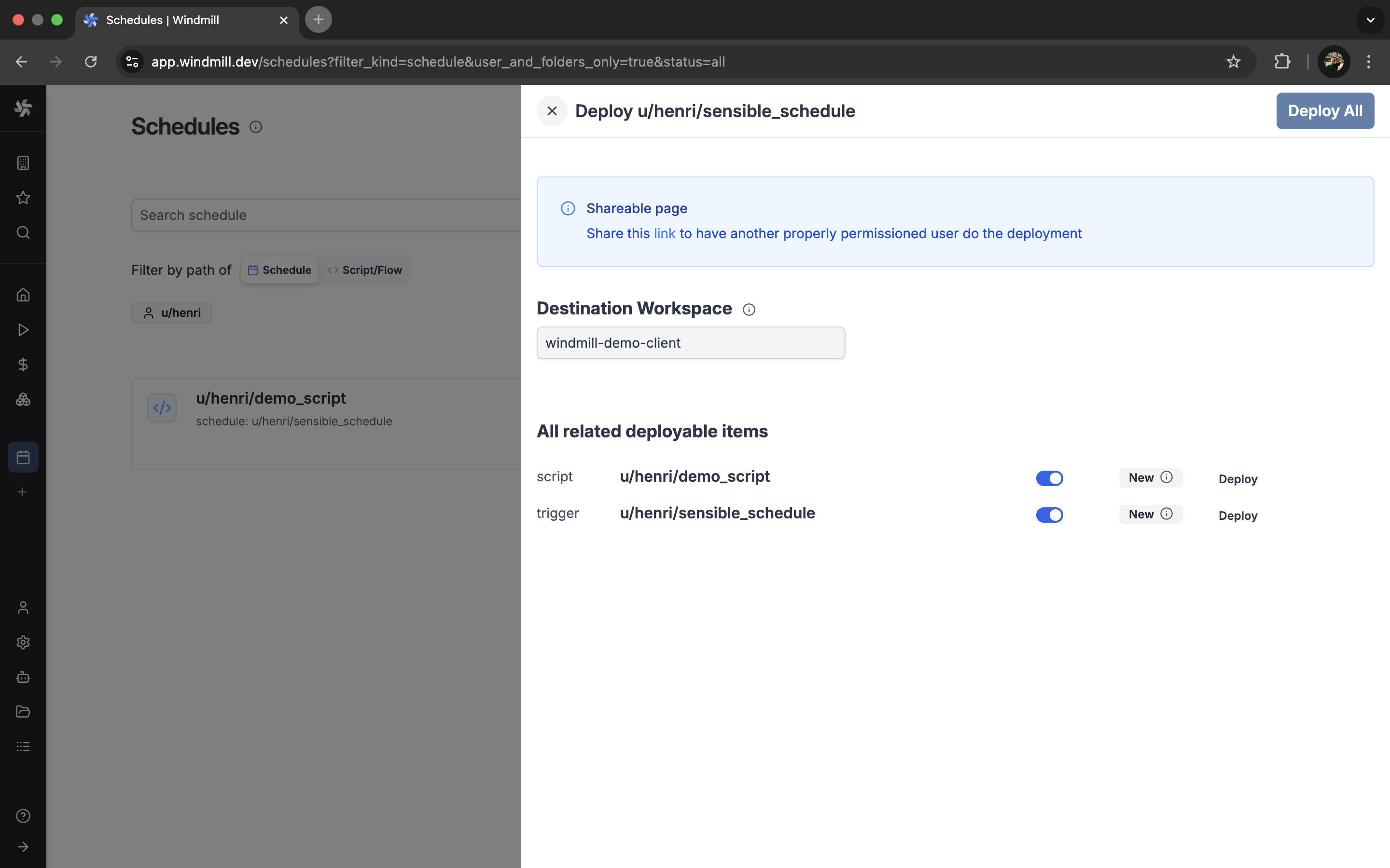- taskScript() and taskFlow() to dispatch to existing Windmill scripts and flows by path.